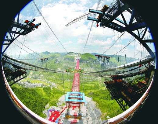 2011年8月18日,矮寨大桥建设现场,建设者采用“轨索滑移法”架设钢桁梁。(资料照片) (记者 刘尚文 摄)
