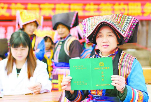 2018年3月8日,道县洪塘营瑶族乡大洞田村,村民展示家庭医生签约服务签约本。(资料图片)何红福 冯正春 摄影报道