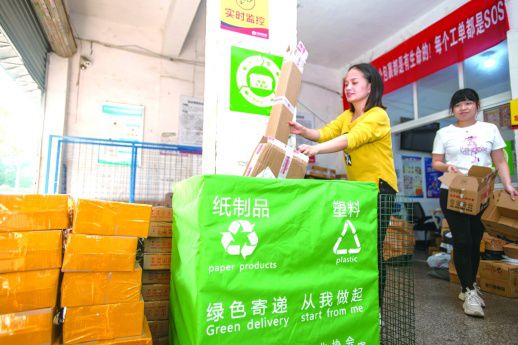 10月9日,长沙市芙蓉区百世快递高岭小区网点,市民将刚拆封的快递包装盒放入回收箱内。当天,湖南首批快递包装回收箱陆续“上岗”,省邮政管理局联合省快递行业协会向邮政、快递企业集中发放回收箱1000个,推进邮件、快件包装分类回收、循环利用。(记者 辜鹏博 摄影报道)