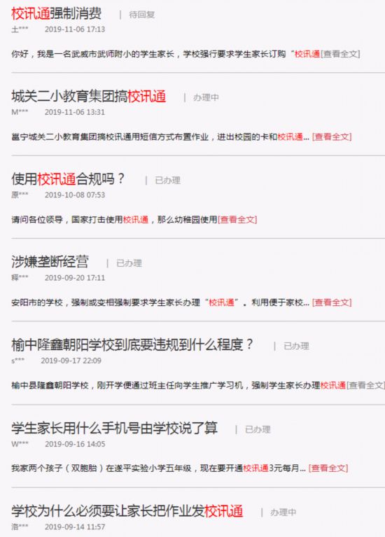 “请主管领导督促纠正不当行为!”甘肃兰州一位家长也在《领导留言板》反映,学校刚刚开学不久,老师便强制学生家长办理“校讯通”。