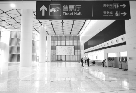 记者在售票大厅见到,整个大厅都是玻璃外墙,采光非常好。大厅的高度约有两层楼高,空间感十足。大厅内除了10个人工窗口外,还在两侧共摆放了20余台自动售票机。人工售票窗口的上方是一块大的电子显示屏,将来的乘车信息、通知、提醒等等重要信息将通过这块显示屏进行发布。大厅的显眼位置还悬挂着一副《沁园春·长沙》。