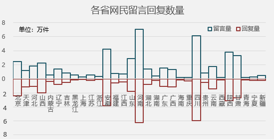 近年来,各地越来越重视网上群众工作,留言办理力度创新高。2019年,31个省区市答复网民留言的数量均实现了同比增长,为历年首次。其中,河南网民留言7.1万件,位居首位;居第二位的是四川网民,留言6.1万件;此外,安徽、陕西、甘肃网民的留言量也都超过了3万件。同时,网民留言回复量突破万件的省份也明显增多,北京、天津、河北、山西、安徽、山东、河南、广东、广西、四川、云南、陕西、甘肃13个省份答复网民留言的数量都超过了1万件,比去年新增了6个省份(见下图)。