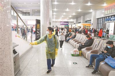 1月31日,高铁娄底南站,工作人员背着重达15公斤的消毒器在候车大厅喷洒消毒液。自1月20日起,该站每日三次对候车大厅、进站口闸机、高铁站台等公共区域进行消毒,保障旅客及客运人员正常、安全出行。记者 辜鹏博 通讯员 朱明维 摄影报道