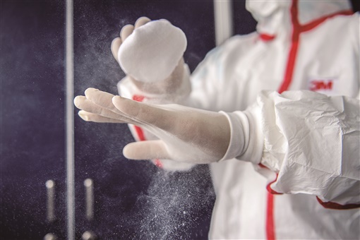 3月2日,湖南支援黄冈医疗队流调检测分队队长蔡亮在第一层乳胶手套上打上爽身粉,这样便于穿戴第二层手套。
