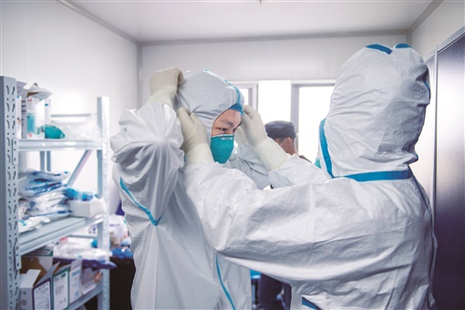 3月2日,湖南支援黄冈医疗队流调检测分队队员曹宇航和同事穿上防护服准备进入核酸检测实验室。进场之前,N95口罩、帽子和医用手套是必不可少的,还须穿上两层防护服,确保防护周全。