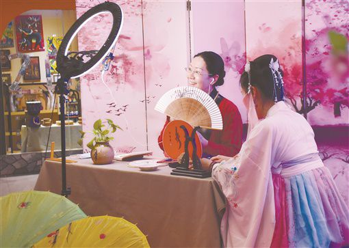 4月18日,湖南雨花非遗馆,江永女书传承人李爱莲(左)在进行“直播带货”。目前,李爱莲每周坚持直播三四场,推广女书系列文创产品,科普女书相关知识,走出了一条非遗推广的新路子。湖南日报记者 徐行 通讯员 刘琛 摄影报道