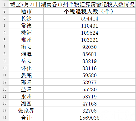 截至7月21日的数据显示,退税人数方面,长沙数量最多,达到594414人,占全省的37.89%;常德为110431人,占全省的7.04%,位居第二;株洲为109524人,占全省的6.98%,位居第三;之后的排名依次是郴州、衡阳、湘潭、岳阳、怀化、娄底、邵阳、益阳、永州、湘西、张家界。
