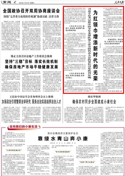 7月的北京,碧空万里,草木葱茏,中国少年先锋队第八次全国代表大会23日上午开幕。中共中央总书记、国家主席、中央军委主席习近平发来贺信,广大少先队员、少先队辅导员、少先队工作者深受鼓舞、倍感振奋。大家表示,习近平总书记的贺信充分体现了党中央对少年儿童的关心关怀,为少先队工作指明了方向,要牢记嘱托,奋发有为,为坚持和发展中国特色社会主义、实现中华民族伟大复兴的中国梦时刻准备着,为红领巾增添新时代的光荣。