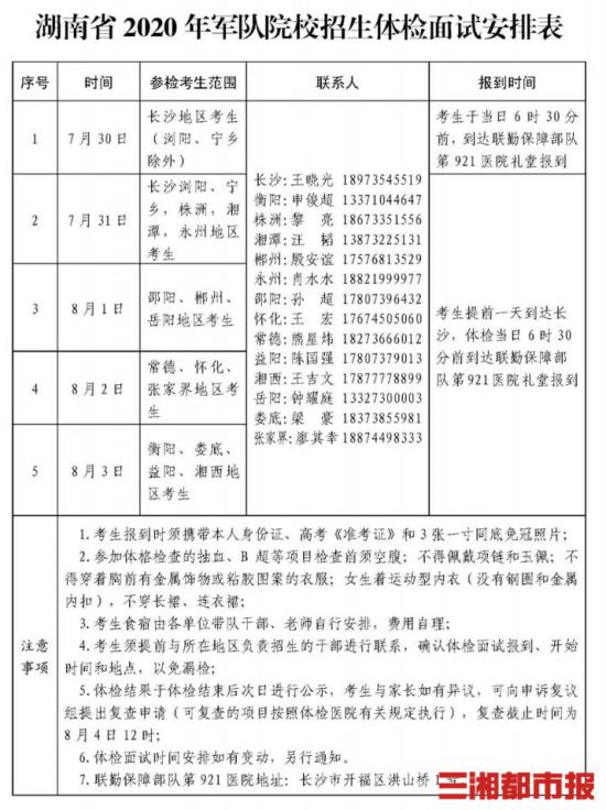据悉,2020年湖南省军校招生体检面试工作在长沙921医院进行(详情见文末表格),考生需按照通知要求,于体检当日6:30前到921医院礼堂报到,经工作人员防疫检查、核对考生身份证和准考证后进入待检区,现场指挥员按10至20人一组进行编组,编组后由引导员带领该组考生前往候检区等待,体检、面试、心理测试交叉进行。