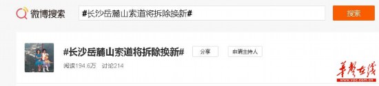 “长沙岳麓山索道将拆除换新”微博话题阅读已达194.6万。微博截图