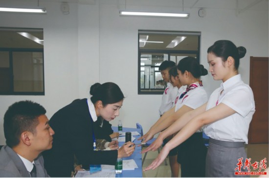 ▲3月20日,长沙航空职业技术学院考点,考官检查报考空乘专业学生有无裸露疤痕。通讯员 供图