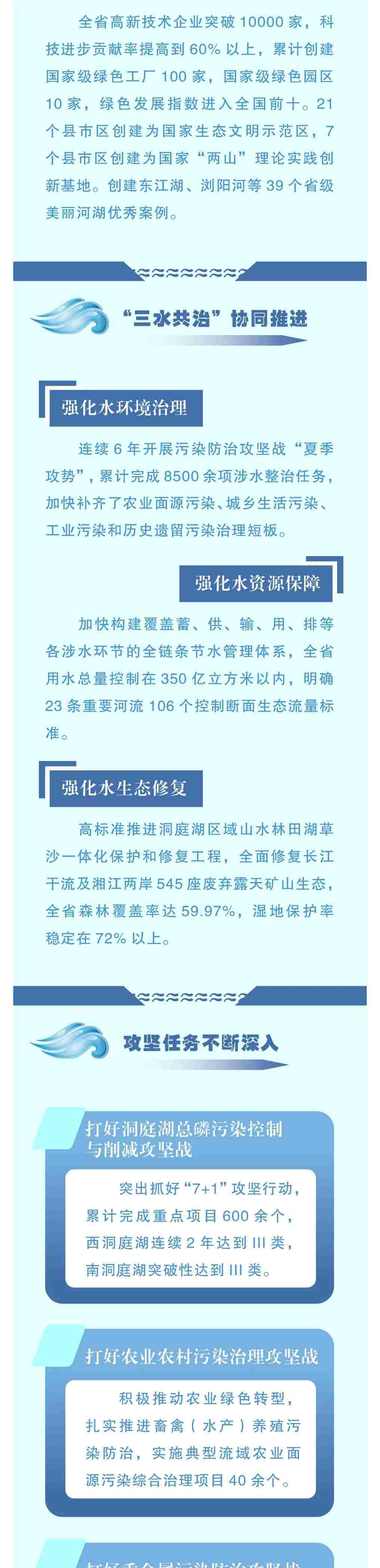 从2017年开始,我省连续6年开展污染防治攻坚战“夏季攻势”,由省长亲自部署,向各市州长交办具体任务,采取工程化、项目化、清单化的方式推动各地各部门集中攻坚克难,累计完成8500余项涉水整治任务。