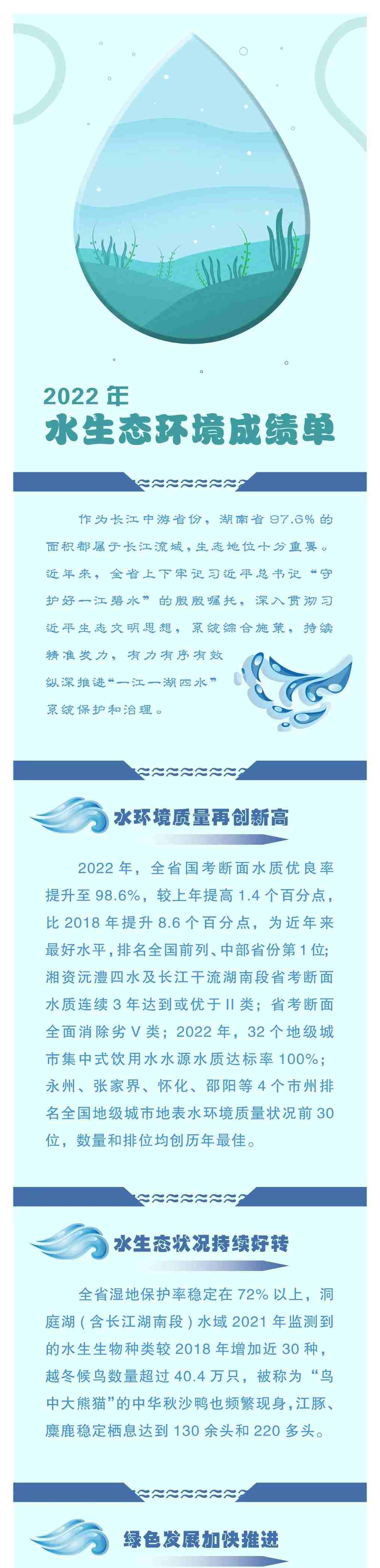 数据显示,2022年,全省国考断面水质优良率提升至98.6%,较上年同期提高1.4个百分点,比2018年提升8.6个百分点,排名全国前列、中部省份第一。