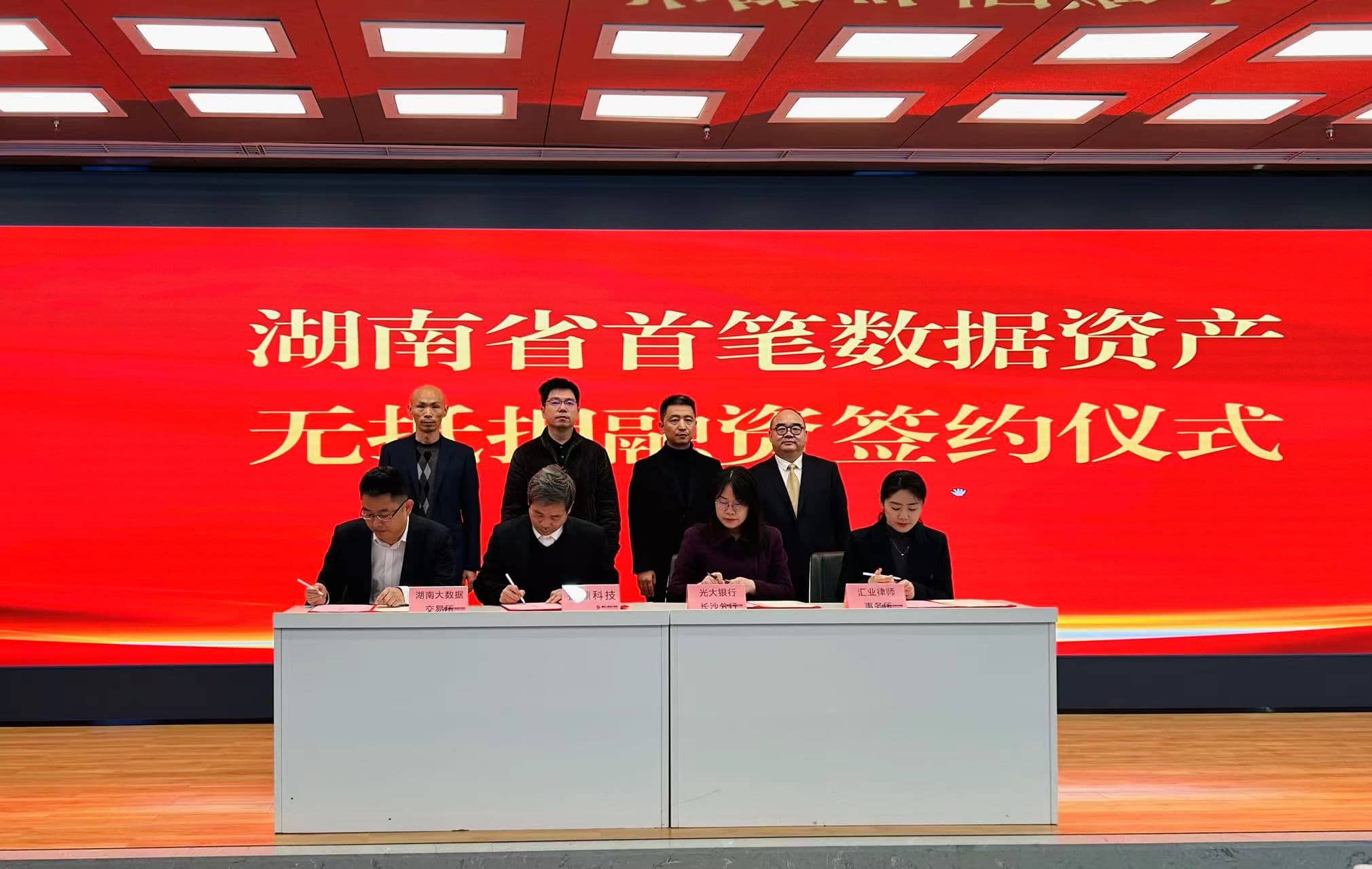 人民网长沙1月11日电(刘汕)1月11日,湖南大数据交易所与光大银行长沙分行、汇业律师事务所、中伦文德律师事务所等专业机构进行签约,帮助湖南本土企业盛鼎科技获得光大银行500万授信额度,完成了湖南首笔数据资产无抵押融资服务。会上,湖南大数据交易所还为盛鼎科技颁发了湖南省首张数据产品登记证书。