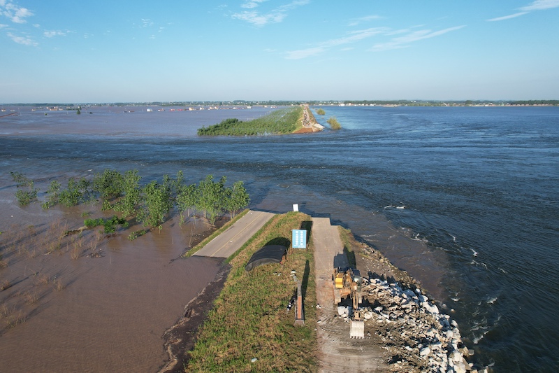 7月6日7时许,记者来到湖南省岳阳市华容县团洲垸一线堤防决口区域,看到水流仍以较快流速涌入垸内,部分房屋已被水淹没至屋顶位置。在通向决口方向的洞庭湖一线大堤上,载满石块和砂石的卡车排成长队,有序驶往决口现场。