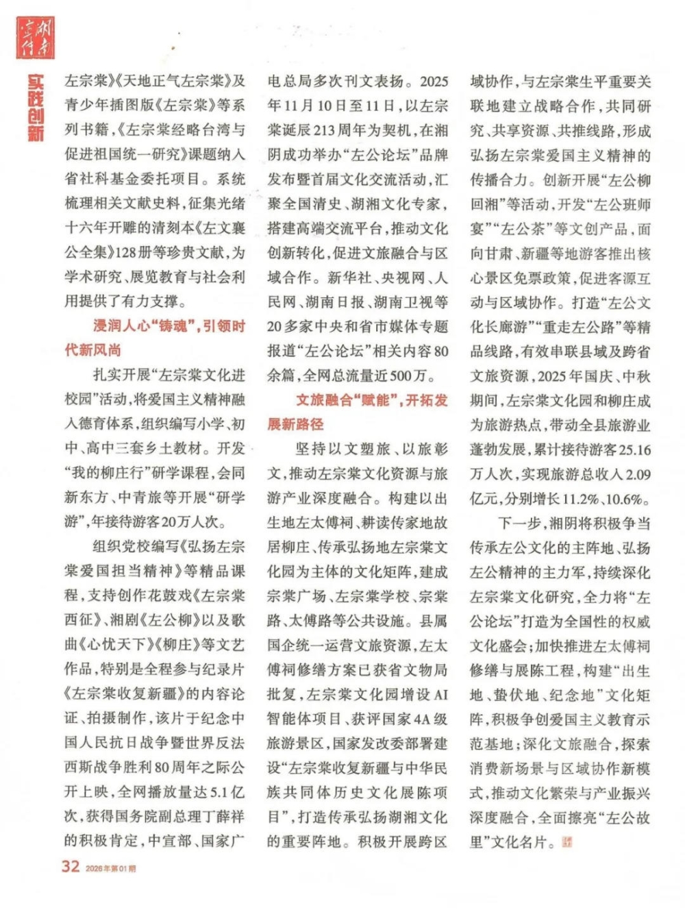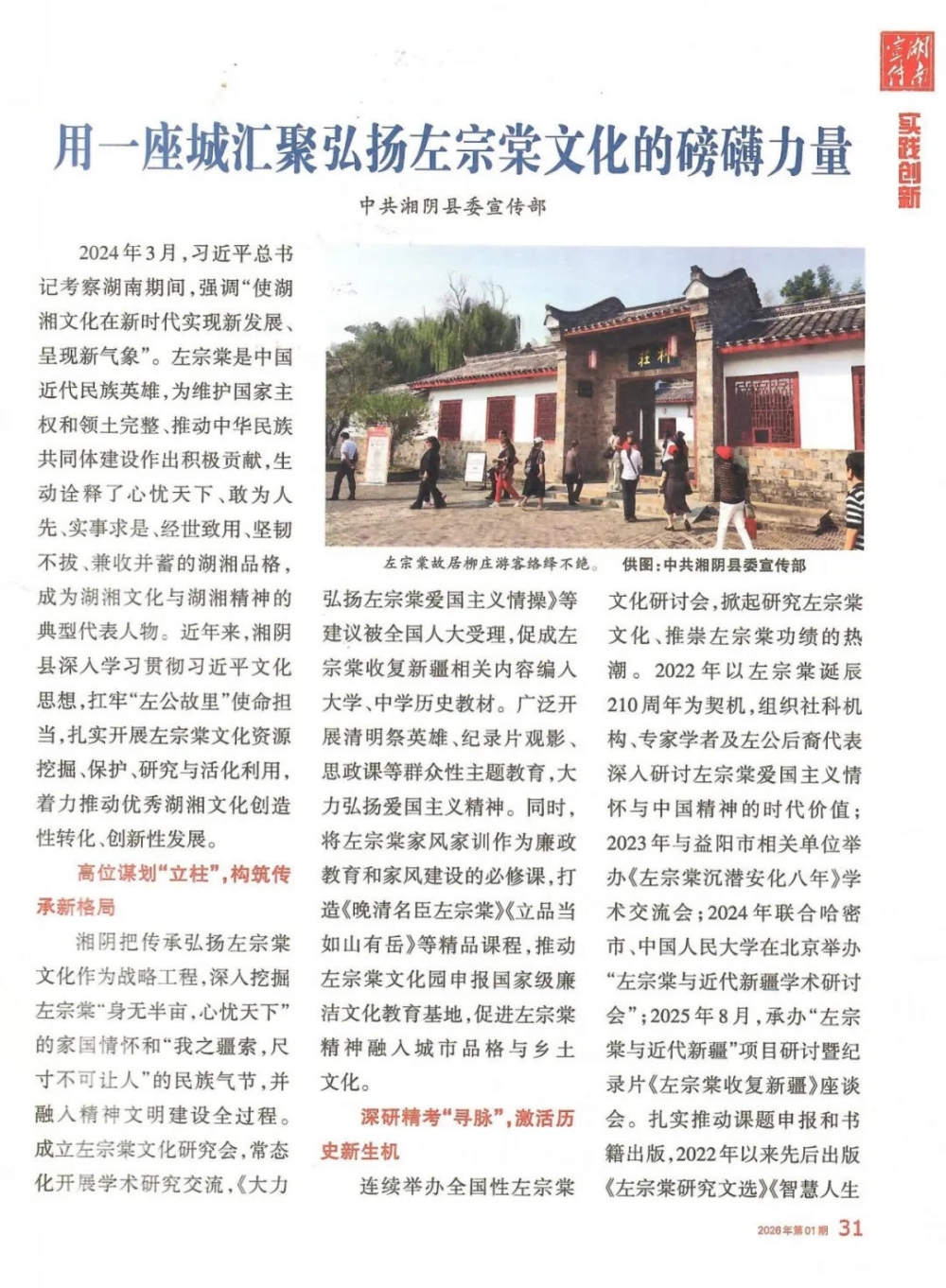 组织党校编写《弘扬左宗棠爱国担当精神》等精品课程,支持创作花鼓戏《左宗棠西征》、湘剧《左公柳》以及歌曲《心忧天下》《柳庄》等文艺作品,特别是全程参与纪录片《左宗棠收复新疆》的内容论证、拍摄制作,该片于纪念中国人民抗日战争暨世界反法西斯战争胜利80周年之际公开上映,全网播放量达5.1亿次,获得国务院副总理丁薛祥的积极肯定,中宣部、国家广电总局多次刊文表扬。2025年11月10日至11日,以左宗棠诞辰213周年为契机,在湘阴成功举办“左公论坛”品牌发布暨首届文化交流活动,汇聚全国清史、湖湘文化专家,搭建高端交流平台,推动文化创新转化,促进文旅融合与区域合作。新华社、央视网、人民网、湖南日报、湖南卫视等20多家中央和省市媒体专题报道“左公论坛”相关内容80余篇,全网总流量近500万。