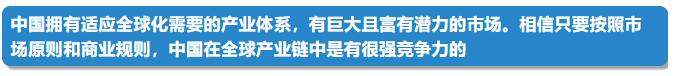 关于产业链调整,李克强表示,经济全球化已经形成了在稳定基础上不断改进的全球产业链,这是各国比较优势和国际分工的必然结果。全球产业链已然形成你中有我、我中有你的局面,其调整也符合产业发展规律。今年前5个月,在全球投资下降的情况下,外商对华投资逆势增长,中国制造业投资同比增长达8%以上。这是因为中国拥有适应全球化需要的产业体系,有巨大且富有潜力的市场。相信只要按照市场原则和商业规则,中国在全球产业链中是有很强竞争力的。我们将继续加大开放力度,支持公平竞争,加强对外来投资合法权益的有力保障。