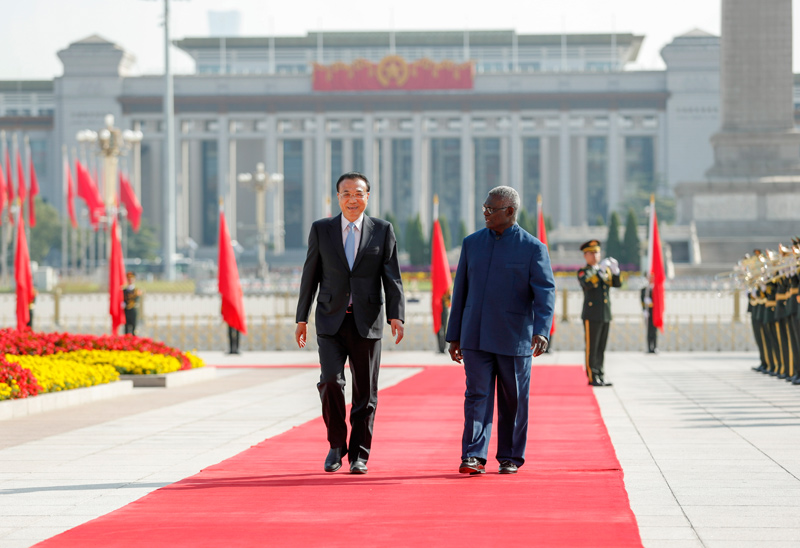 李克强表示,中国同所罗门群岛正式建立外交关系,翻开了两国关系的新篇章,符合两国和两国人民的根本利益,将有力促进双方共同发展,也有利于地区国家共同维护稳定、实现繁荣。中国一贯主张大小国家一律平等,支持贵国政府发展经济、改善民生的努力。中方赞赏所罗门群岛政府作出恪守一个中国原则的承诺,愿同所方加强战略沟通,增进政治互信,推动两国关系开好局、起好步,引导两国各界加强交流,增进互利共赢的民意基础,更好造福两国和两国人民。