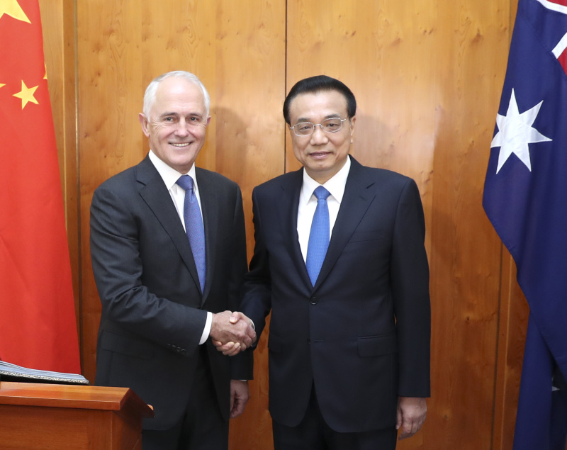 李克强表示,建交45年来,中澳友谊日益加深,各领域合作不断向前发展。中方愿同澳方继续本着平等相待的原则,尊重彼此核心利益和重大关切,巩固政治互信,加强战略沟通,推动务实合作提质升级,确保中澳关系持续健康稳定发展。