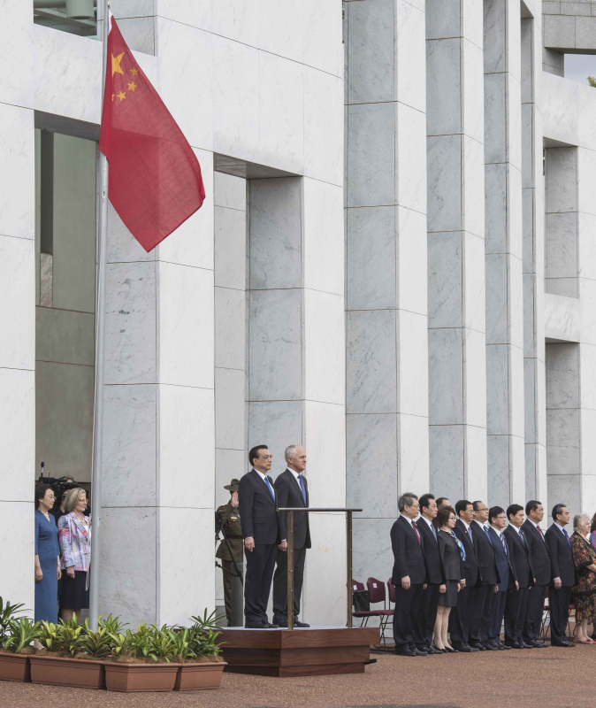 会谈前,特恩布尔在议会大厦广场为李克强举行隆重欢迎仪式。现场鸣礼炮19响,仪仗队行持枪礼,军乐队高奏中澳两国国歌。李克强检阅了仪仗队。两国国旗在广场上空迎风飘扬。
