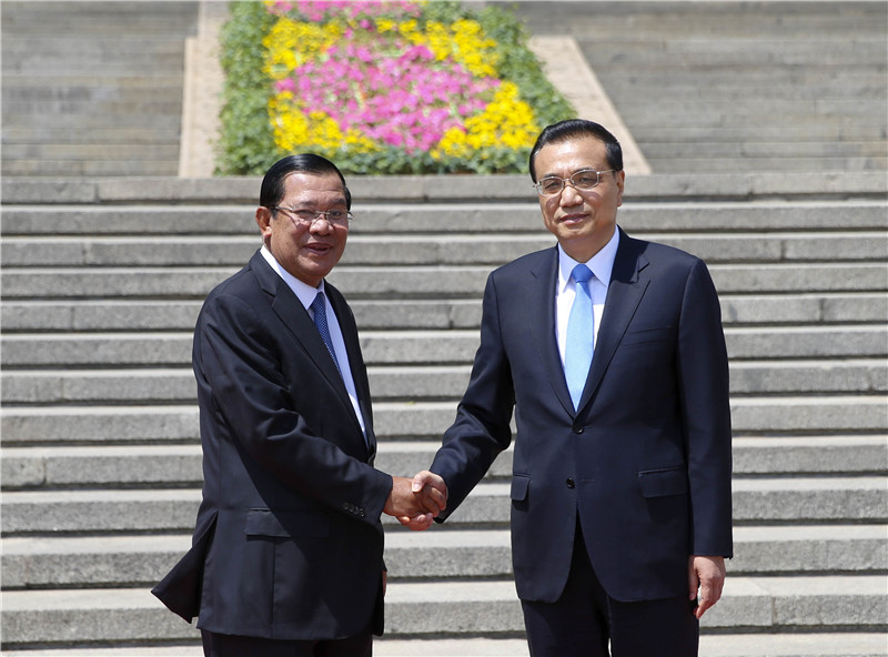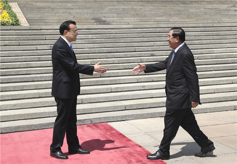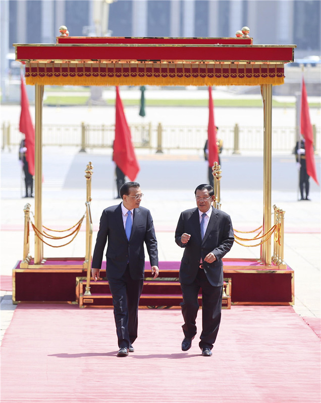 国务院总理李克强5月16日上午在人民大会堂东门外广场举行仪式,欢迎柬埔寨首相洪森来华进行正式访问并出席“一带一路”国际合作高峰论坛。