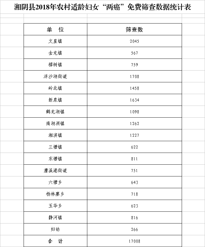 湘阴县2018年农村适龄妇女“两癌”免费筛查数据统计