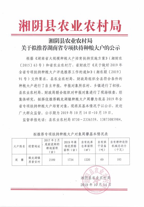 湘阴县农业农村局关于拟推荐湖南省专项扶持种粮大户的公示