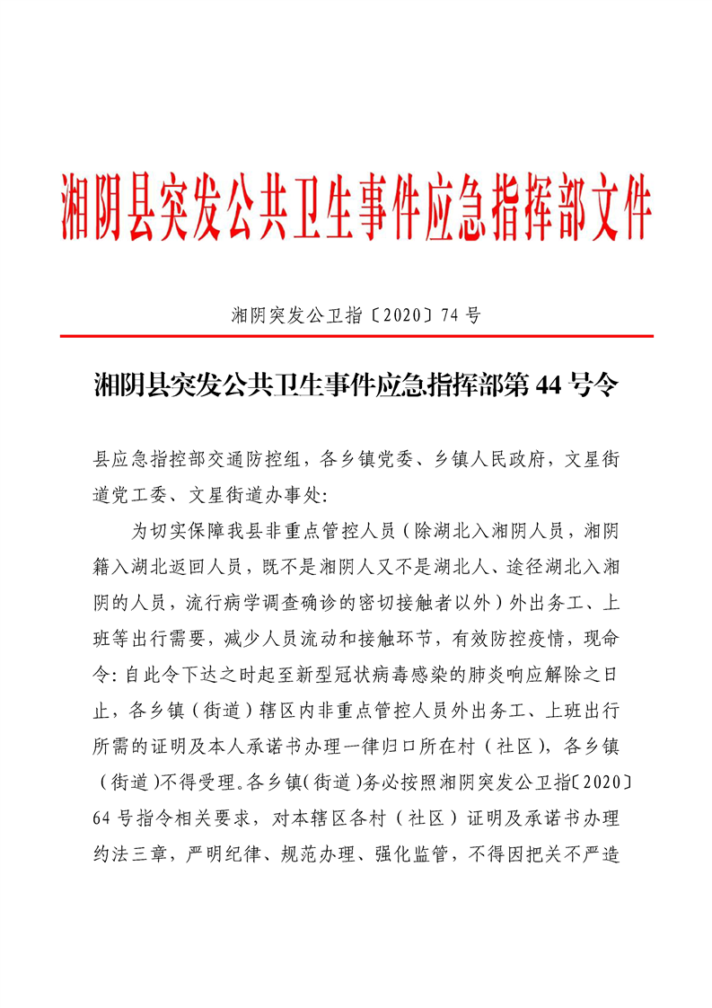 湘阴突发公卫指74号(湘阴县突发公共卫生事件应急指挥部第44号令)