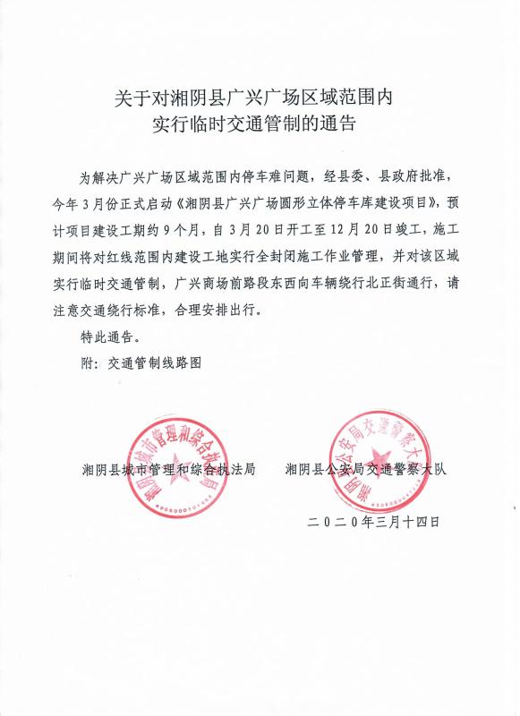关于对湘阴县广兴广场区域范围内实行临时交通管制的通知