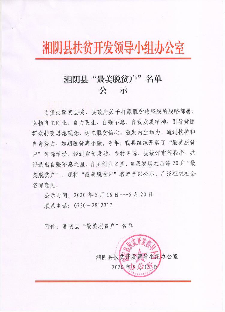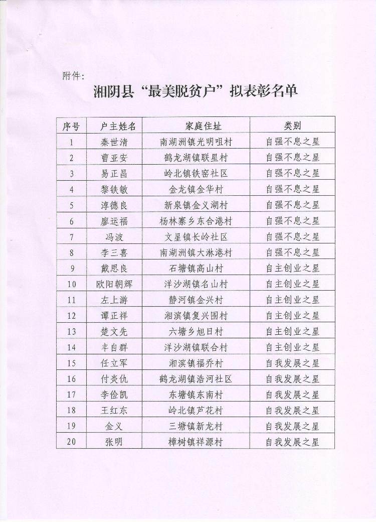 湘阴县“最美脱贫户”名单公示