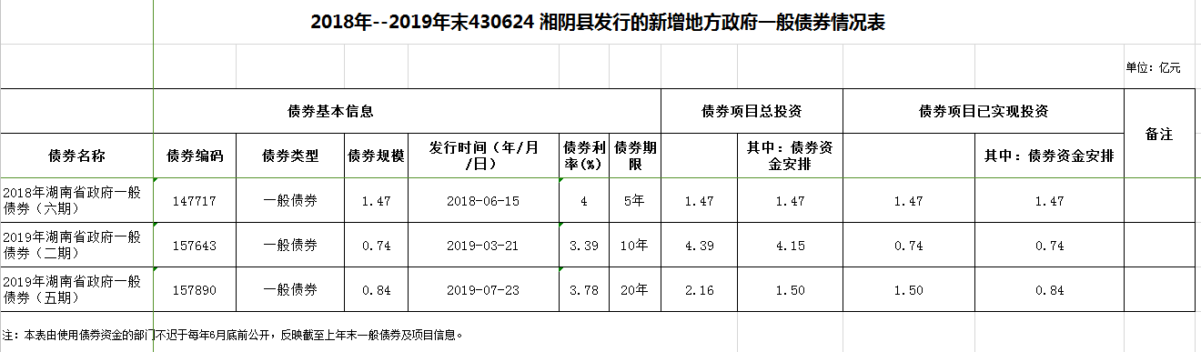 2018年--2019年末430624 湘阴县发行的新增地方政府一般债券情况表