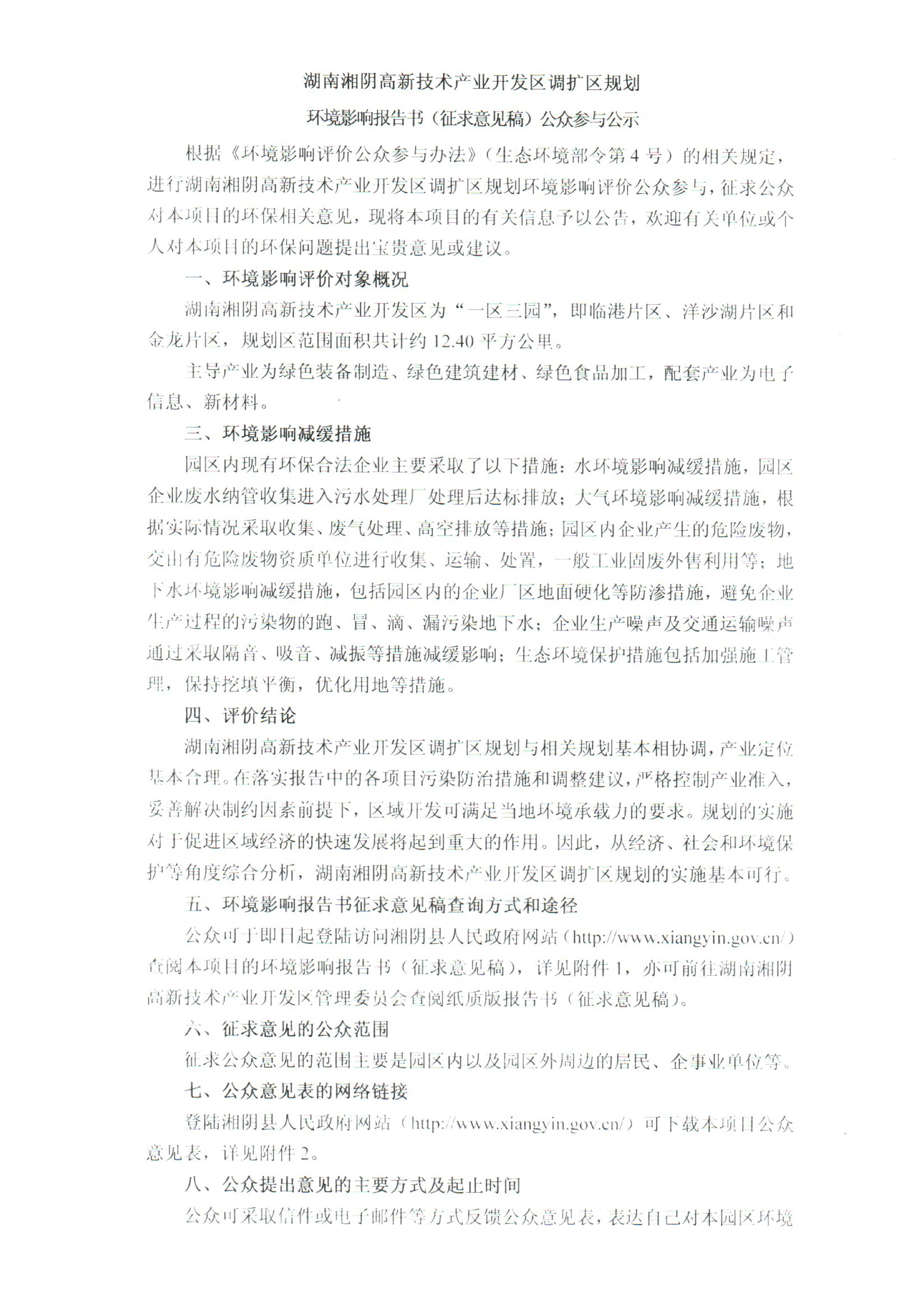 湖南湘阴高新技术产业开发区调扩区规划环境影响报告书(征求意见稿)公众参与公示