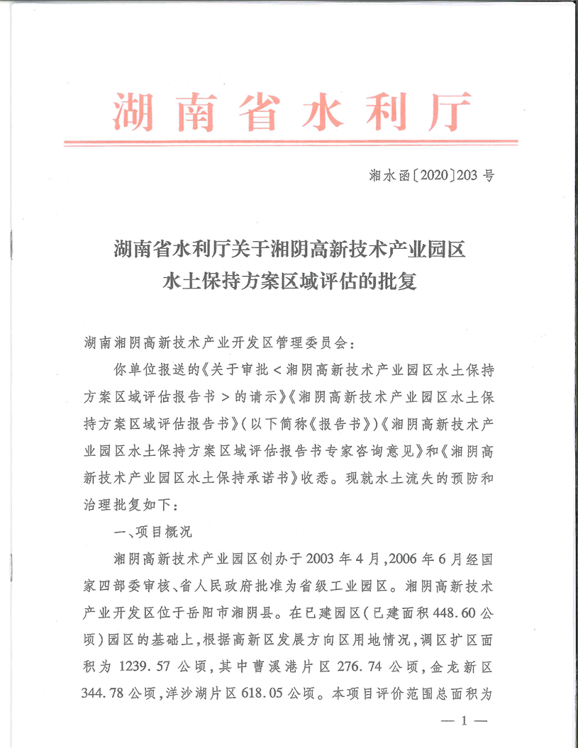 湖南省水利厅关于湘阴高新技术产业园区水土保持方案区域评估的批复