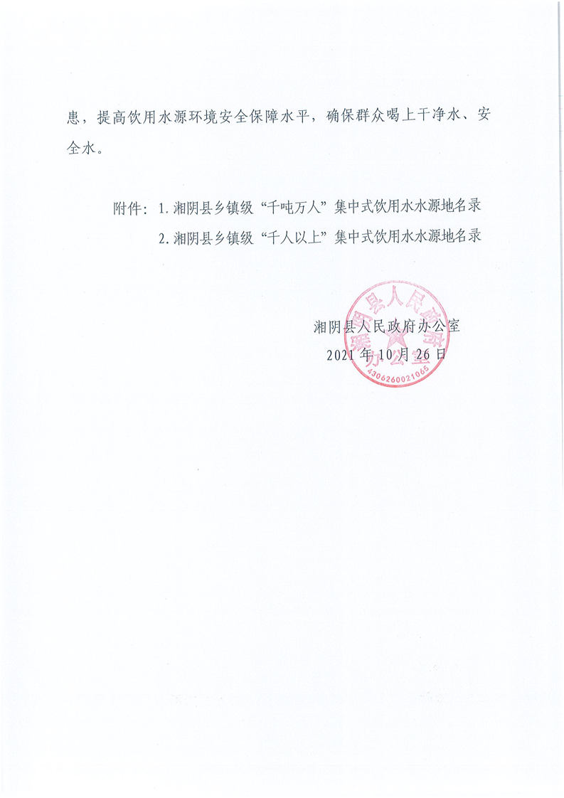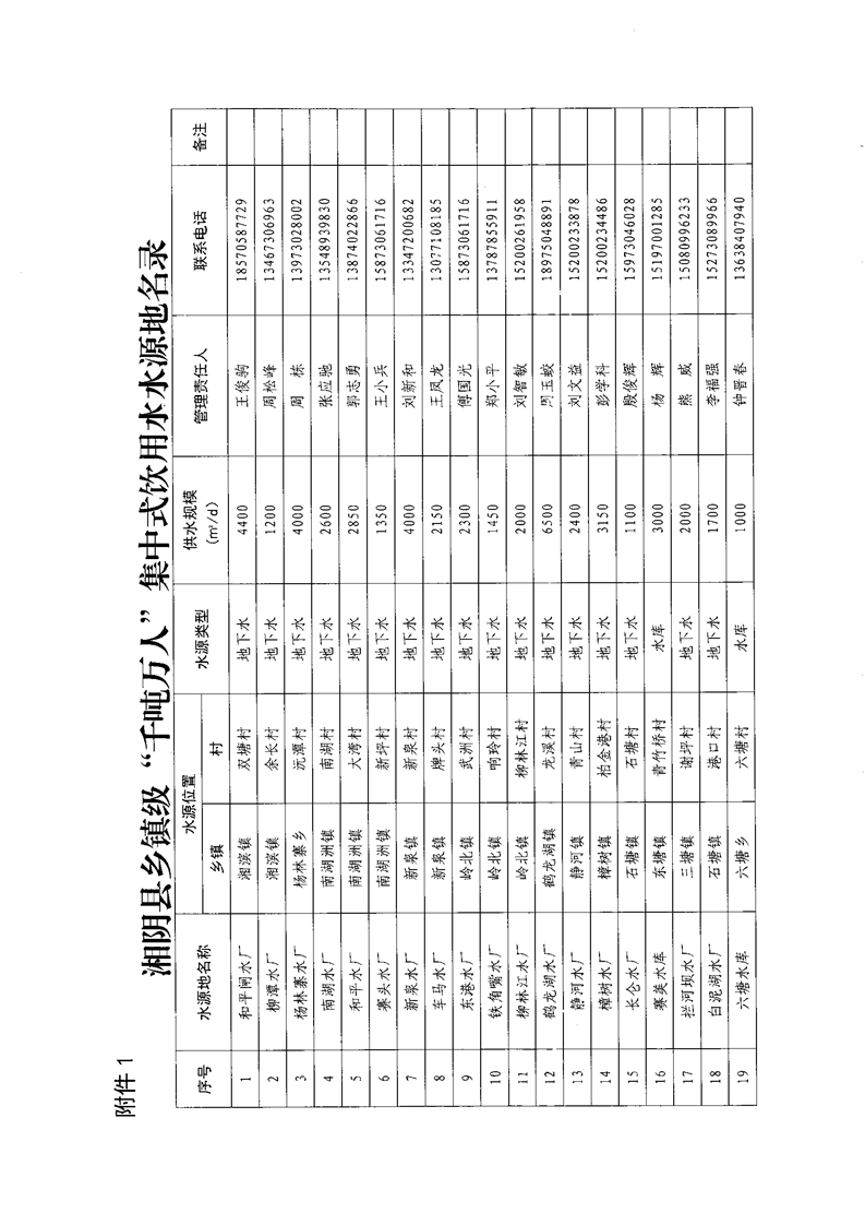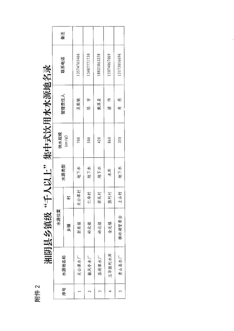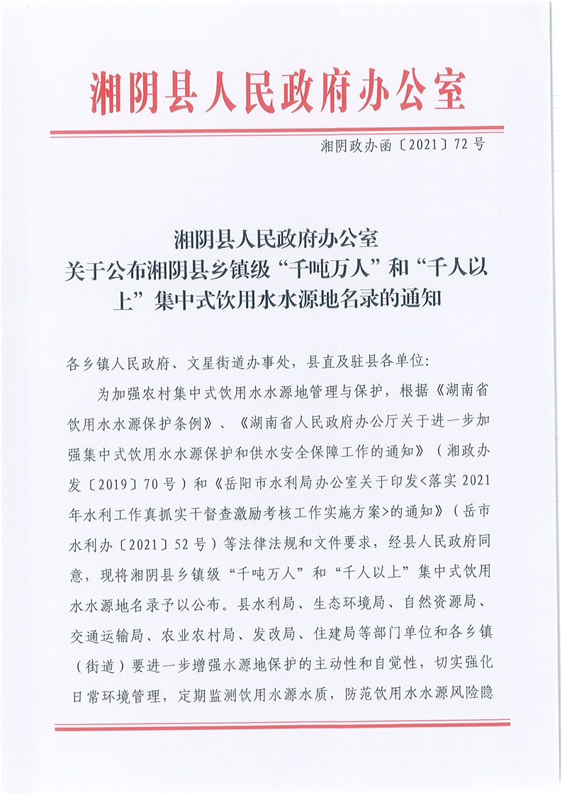 关于公布湘阴县乡镇级“千吨万人”和“千人以上”集中式饮用水水源地名录的通知