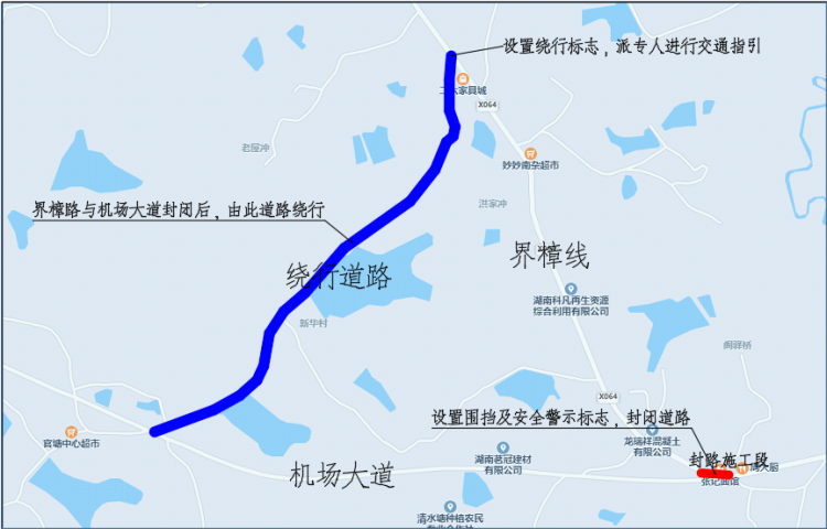 因湘阴县城乡供水一体化工程(湘江水厂)管网施工,需对“界樟路与机场路”交汇处进行破路施工,施工期间该段道路无法通行,需进行绕路施工。该路段自2022年5月18日至2022年5月19日全天进行交通管制,封闭该路段的车辆通行。