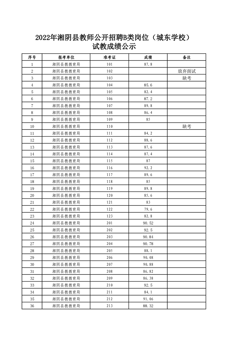 2022年湘阴县教师公开招聘B类岗位(城东学校)试教成绩公示