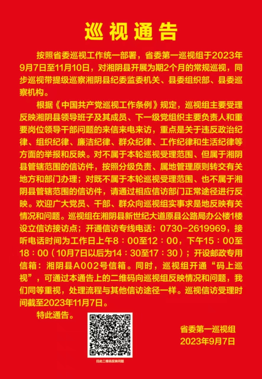 根据《中国共产党巡视工作条例》规定,巡视组主要受理反映湘阴县领导班子及其成员、下一级党组织主要负责人和重要岗位领导干部问题的来信来电来访,重点是关于违反政治纪律、组织纪律、廉洁纪律、群众纪律、工作纪律和生活纪律等方面的举报和反映。对不属于本轮巡视受理范围、但属于湘阴县管辖范围的信访件,按照分级负责、属地管理原则转交有关地方和部门办理;对既不属于本轮巡视受理范围、也不属于湘阴县管辖范围的信访件,请通过相应信访部门正常途径进行反映。欢迎广大党员、干部、群众向巡视组实事求是地反映有关情况和问题。巡视组在湘阴县新世纪大道原县公路局办公楼1楼设立信访接访点;开通信访专线电话:0730-2619969,接听电话时间为工作日上午8∶00至12∶00,下午15∶00至18∶00(10月7日以后为14∶30至17∶30);开设邮政专用信箱:湘阴县A002号信箱。同时,巡视组开通“码上巡视”,可通过本通告上的二维码向巡视组反映情况和问题,我们同等重视,处理流程与其他信访途径一样。