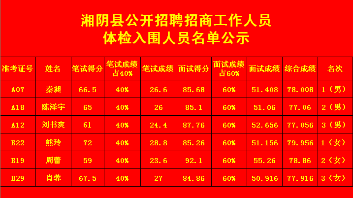 湘阴县公开招聘招商工作人员综合成绩及体检入围名单公示