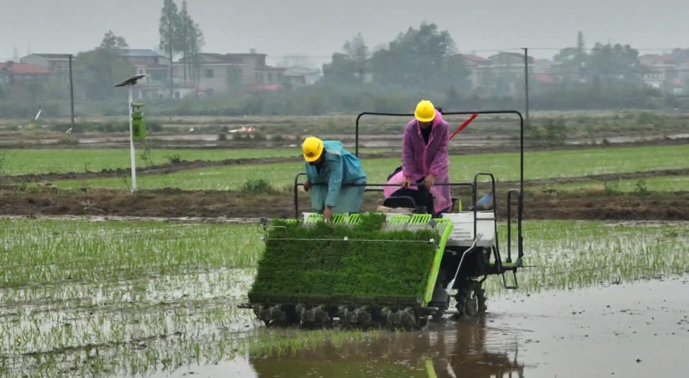 将卷好的秧盘运至田间,农机手驾驶着插秧机与装秧员巧妙配合,一株株嫩绿的秧苗从插秧机苗盘上依次滑落,整齐插入田地里,为早稻田披上一袭绿色的“新装”,焕发出勃勃生机。