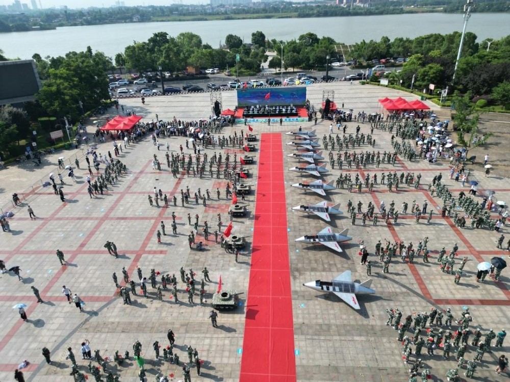 五月的宗棠广场上骄阳似火,孩子们精心准备,穿上了迷彩服,戴上了军帽。坦克、飞机等模型通过精心布置,模拟战斗的氛围,仿佛把孩子们带到战争年代。“全体肃立!升国旗,奏国歌!”伴随着雄浑激荡的《义勇军进行曲》响起,鲜艳的五星红旗迎风飘扬,全场人员伴着旋律唱起国歌,爱国的主旋律奏响在宗棠广场的每一个角落。
