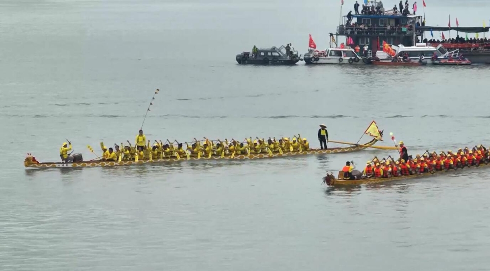 江面上,鼓声阵阵,一条条龙舟劈波前行,抢滩争雄;一群群江豚跃出江面,逐浪戏水,蹁跹起舞,一幅“蛟龙竞渡,江豚伴舞”美丽画卷在这片水域徐徐展开。