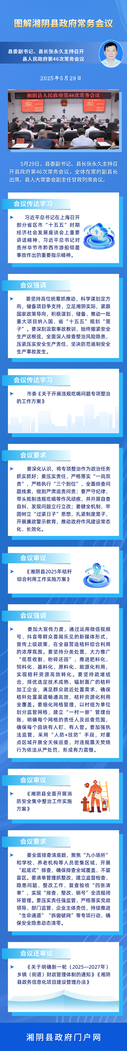 会议传达学习了习近平总书记在上海召开部分省区市“十五五”时期经济社会发展座谈会上重要讲话精神、习近平总书记对贵州毕节市黔西市游船倾覆事故作出的重要指示精神。会议强调,要坚持高位统筹抓推动,科学谋划定方向,储备项目争支持,立足湘阴实际,紧跟国家政策导向,积极谋划、储备、推动一批重大项目纳入国、省“十五五”规划“笼子”。要深刻汲取事故教训,始终绷紧安全生产这根弦,全面深入排查整治风险隐患,压紧压实安全生产责任,坚决防范遏制安全生产事故发生。
