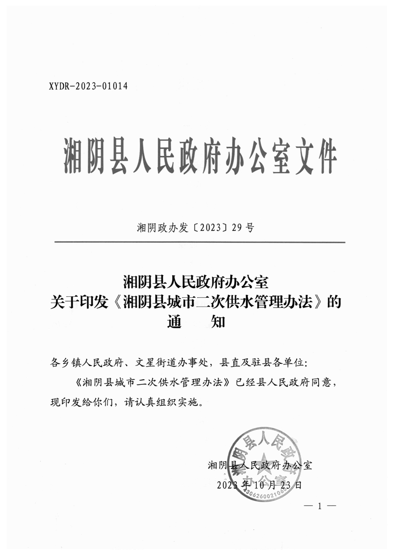 关于印发《湘阴县城市二次供水管理办法》的通知