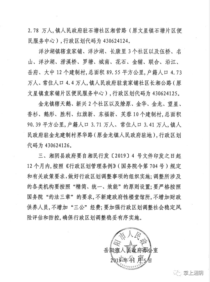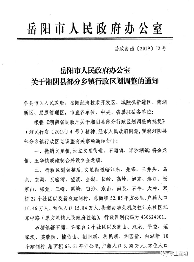 岳阳市人民政府办公室关于湘阴县部分乡镇行政区划调整通知
