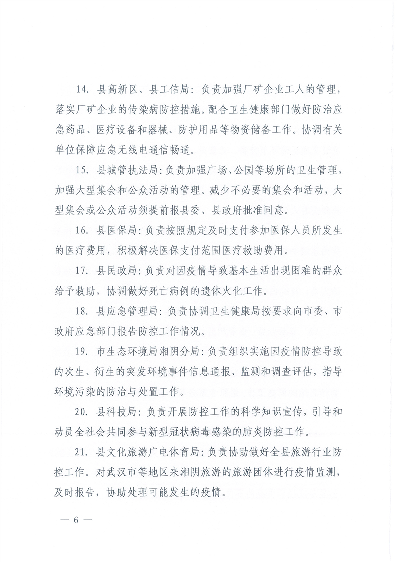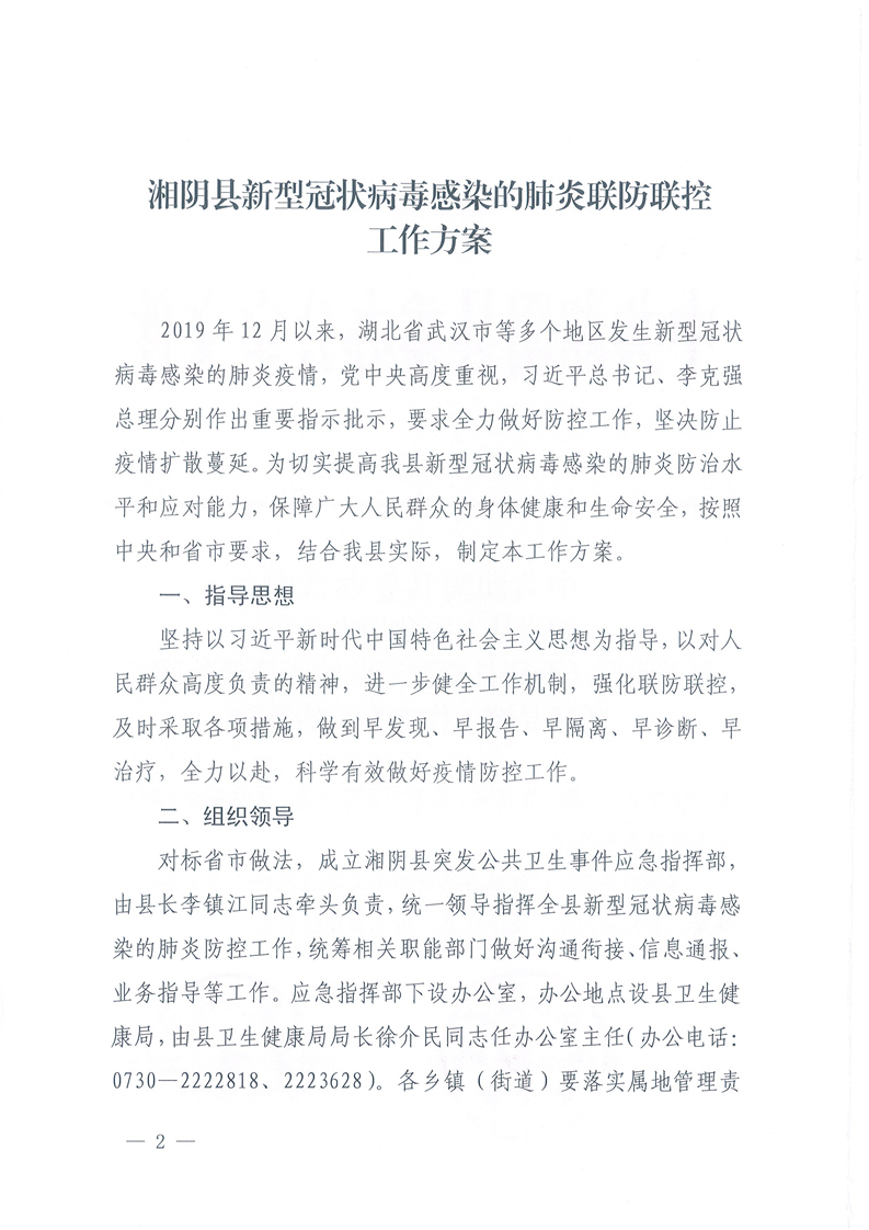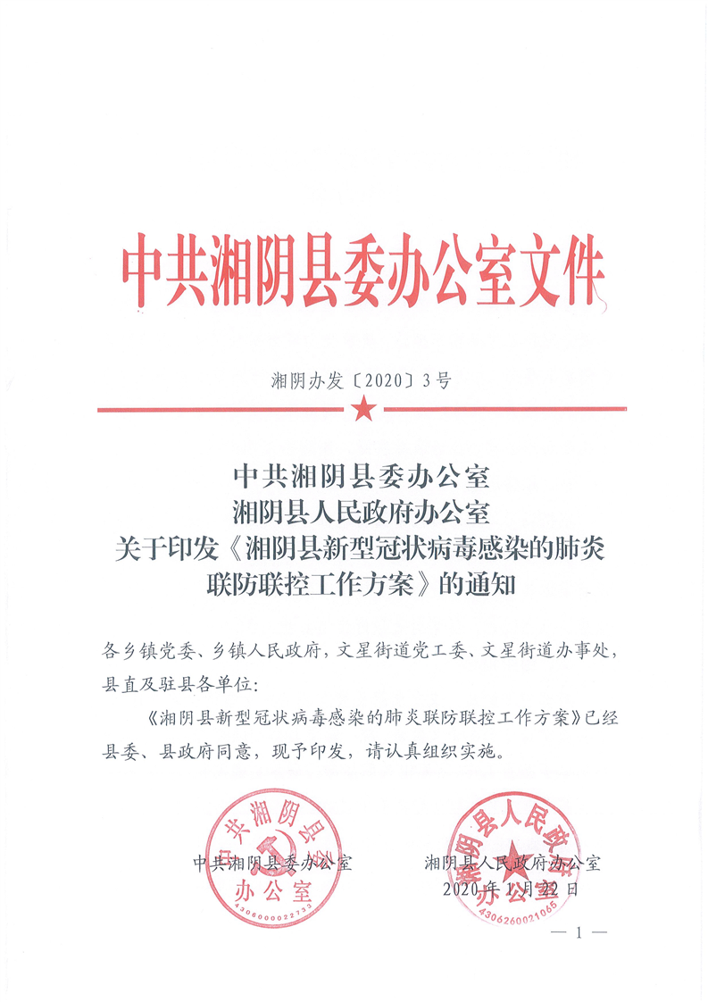 关于印发《湘阴县新型冠状病毒感染的肺炎联防联控工作方案》的通知