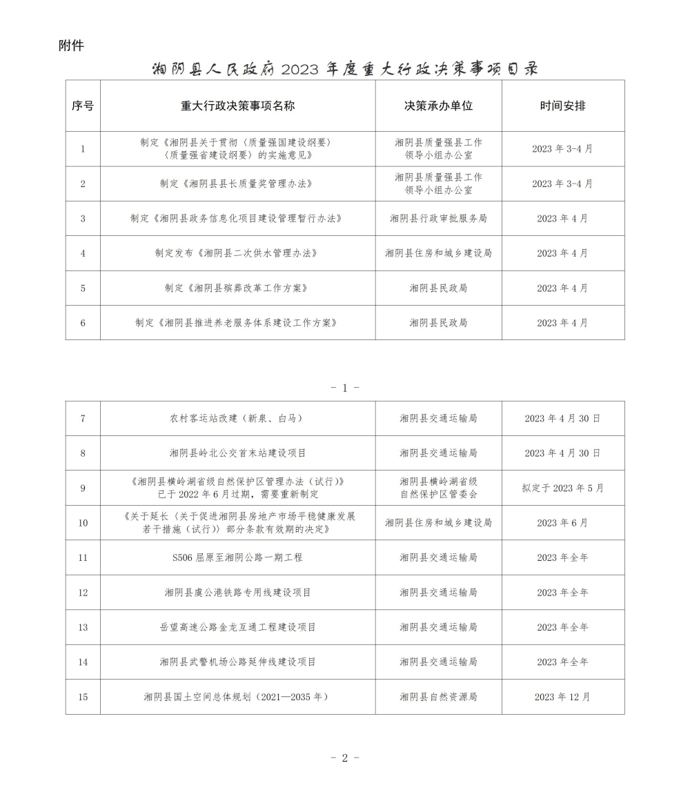 附件:湘阴县人民政府2023年度重大行政决策事项目录