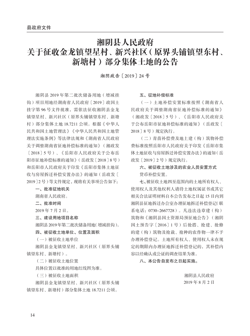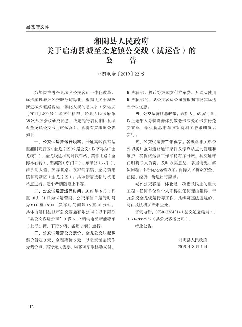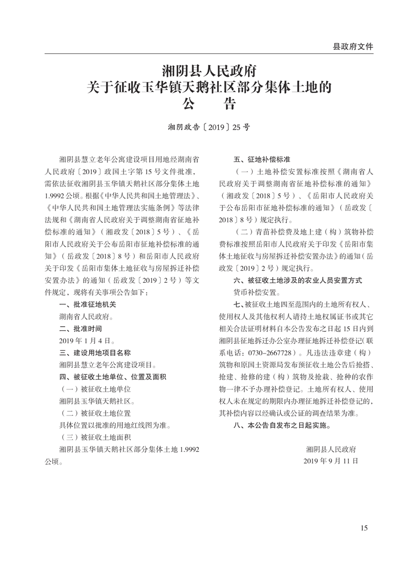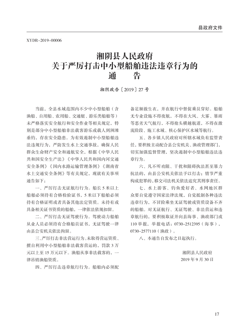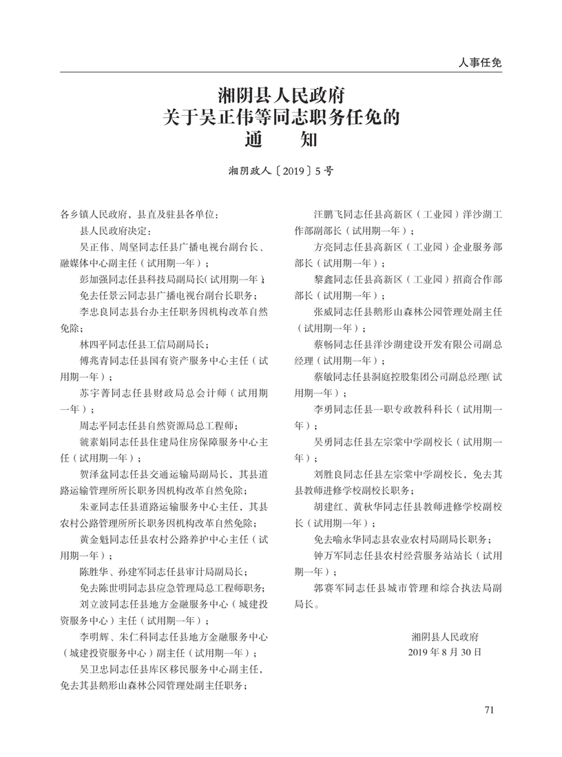 湘阴县人民政府公报2019年第三期 出版日期:2019年10月09日出版