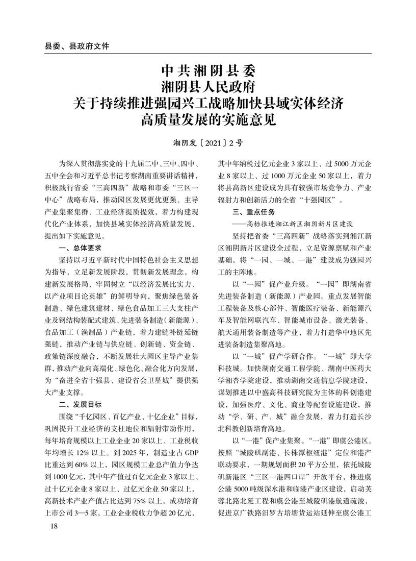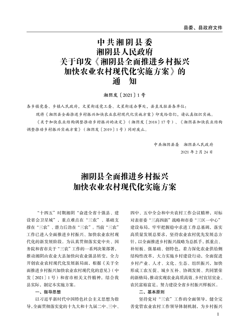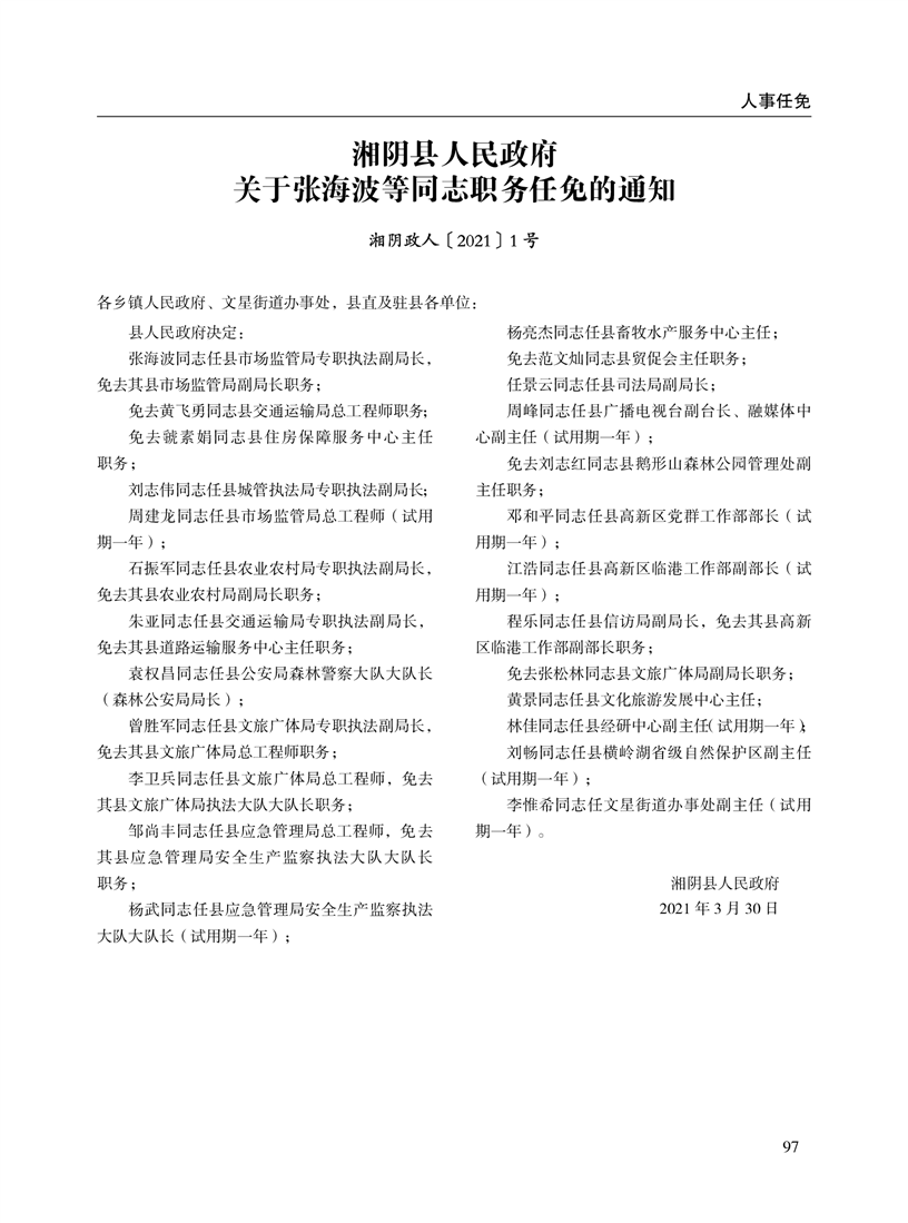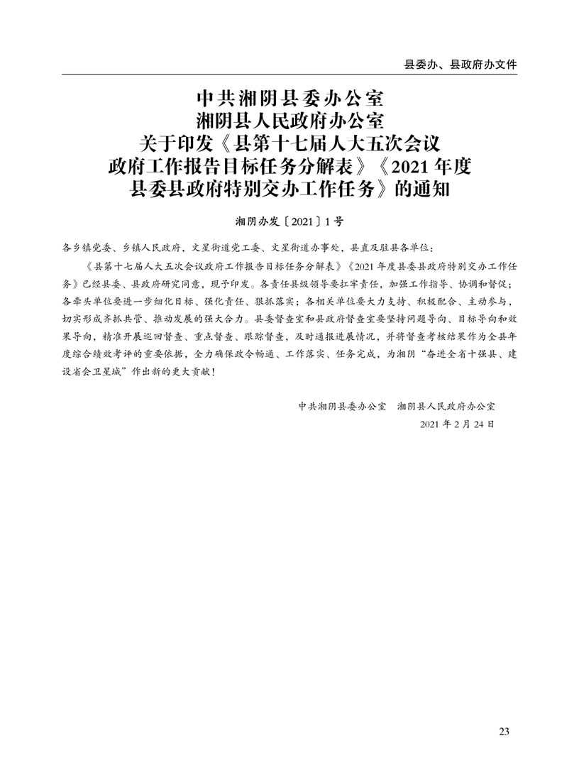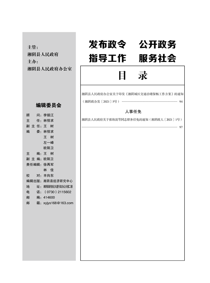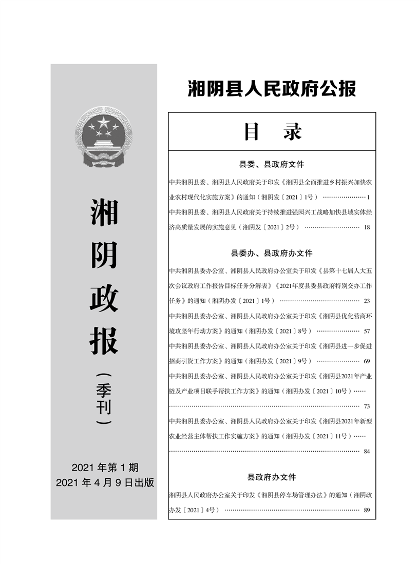 湘阴县人民政府公报2021年第一期 出版日期:2021年04月12日出版