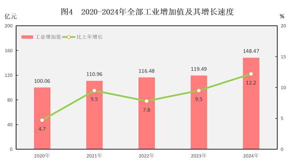 全年全部工业增加值148.47亿元,比上年增长12.2%。分门类看,采矿业增长12.5%,制造业增长11.9%,电力、热力、燃气及水生产和供应业增长16.2%。