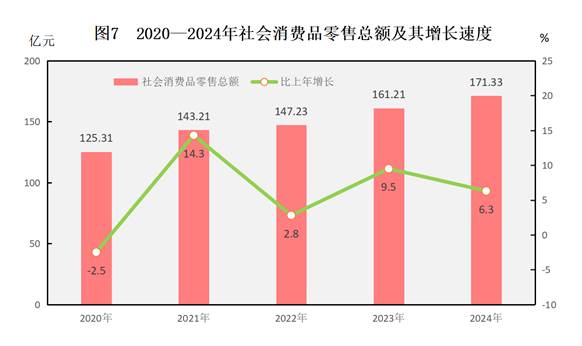 全年社会消费品零售总额171.33亿元,比上年增长6.3%。按消费类型分,商品零售额142.43亿元,增长6.2%;餐饮收入28.90亿元,增长6.9%。